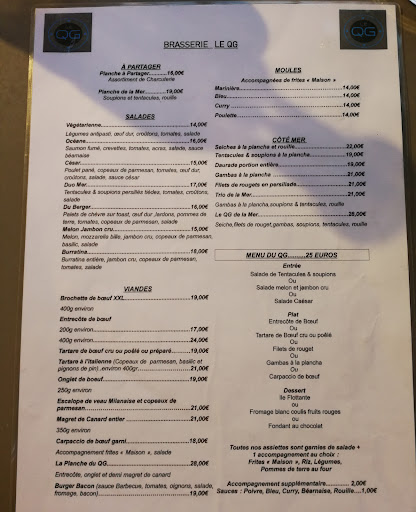 Read moreBonsoir, Mon Épouse, nos enfants et moi avons dîné au QG ce soir. Lorsque nous sommes arrivés bien que la terrasse était comble de monde, la dame de service a eu la gentillesse de nous organiser une table avec un collègue à elle malgré que nous étions six adultes. Nous avons pris une planche de charcuterie en accompagnement de notre apéritif, ..... bonne pitance ! En entrée des repas "QG" nous avons pris la salade César, très belle assiette et je recommande les pièces de poulet panés maison qui sont délicieux ! Les plats .... l'escalope à la crème et son accompagnement un véritable régal.... l'escalope à la Milanaise et les frites !!!! Une véritable merveille, Mon Épouse qui s'est laissée tenter par les moules frites s'est "bardé " .... et enfin pour ma part j'ai pris une entrecôte.... pfuhhhh un pure moment de plaisir pour mes papilles. Notre repas s'est terminé par des tartes au citron et des îles flottantes en toute simplicité. Les personnes de salle ont été absolument gentils malgré la très forte affluence et la pression qu'ils subissaient. Leur terrasse non loin des bateaux de plaisance est un délice de calme, et la clientèle discrète. Alors merci à cette formidable équipe pour cette bulle temporelle et culinaire. Amitié...