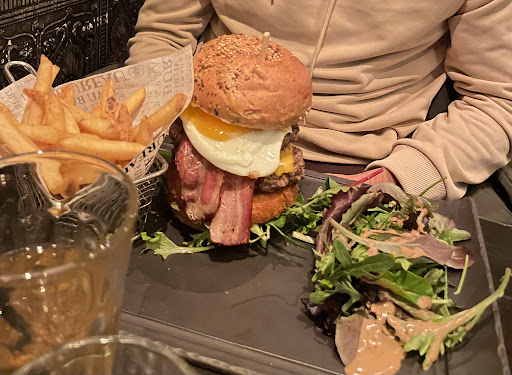Still sat at the restaurant while typing this, but thought a review is much needed. Service is good and the atmosphere is chill. We thought this won’t be a good choice as we were looking for “French” food and this place had a very English feel to it, with London post code decorations all around. We went for the pulled pork burger (€17 with fries) and a massive €21 double beef Empire state burger, also with fries, and I must say, they were both unbelievable!!! Only negative things I could say was that we wanted medium cooked beef and it was more medium-well done and the music was a little too loud and clubby for a chill/ pub-y place. Other than that, would definitely recommend!!! No space for dessert and was too busy eating to take a photo of the pulled pork burger 😅. Also, big screen for football...