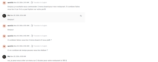 Read moreIl y a un mois et demi, vous m'avez contacté via mon profil avec l'idée de concevoir trois menus écrans pour votre restaurant. Après avoir discuté des détails, nous avons convenu d'un accord pour 200 $. J'ai consacré mon temps et mes efforts à créer les trois modèles, en veillant à ce qu'ils répondent à vos attentes et soient livrés rapidement. Cependant, une fois les conceptions terminées et vous ont été remises, vous avez choisi de ne pas remplir votre part du contrat et avez refusé de payer le montant convenu. Malgré mes suivis répétés, vous m'avez laissé sans rémunération pour le travail que j'ai effectué avec dévouement et professionnalisme. Pour résoudre ce problème et maintenir la transparence, je partage désormais des captures d'écran de nos discussions pour informer les autres acteurs du secteur de votre conduite et pour mettre en garde les restaurateurs sur la manière dont vous gérez de telles...