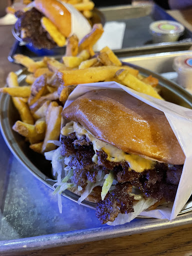 Read moreLa deco est très basique, pas mal de choix de burger et de divers façon de les cuisiner, divers accompagnements disponibles ainsi que divers boissons, on trouve quand même son bonheur. J’ai commander un pulled pork burger avec supplément japalenos pas de bol, ils ont oublié. Pas grave ils se sont proposé de m’en refaire un avec mais il était 2 fois plus garnie donc mieux servie que le premier ??? Je sais qu’il a voulu être gentil et se rattraper mais ça porte à confusion. Et il m’a quand même rendu le burger entamé mais ça faisait vraiment trop. Tu coup le burger était tellement charger en porc et coleslaw ça dégouliner et déborder de partout et j’avais plus vraiment l’impression de manger un burger mais plus de la bouillie dommage car ça partait d’une bonne intention. Les frites par contres été archi cuite et recuite limite un goût de carbonisé. Pareil les sanitaires à nettoyer un peu plus souvent, ne saurait...