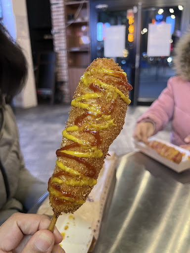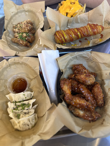 First of all it was nice that you could order on the machine. The service was quick and we got disposable gloves for the wings. Now, the wings were nothing spectacular, with very small wings, the sauce was not “gochu banging” - not very spicy or crazy, and the soy and garlic one was meh. The corndog had only half of a sausage, so too much cheese and was ok with a bit of crispiness but not worth the price. The dumplings were almost RAW- with this unrecognisable white paste raw filling, nothing like beef. I couldn’t call this Korean cuisine, would suit the tasteless - but so not worth it. But the kpop music in the background...