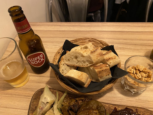 The service is efficient, quickly serving the bottle of beer with a complimentary glass filled with peanuts. The slices of baguette are nice, to accompany the plancha of grilled marinated vegetables and burrata. The quality of the components of the plancha is inconsistent: zucchini overcooked, part of artichoke is hard and the taste of sweet onion confit doesn’t match well with the vegetables. Prices of drinks and dishes are reasonable for the area. There was a DJ playing non-Italian music on that Friday night, while some tables outside are facing a TV screen displaying a soccer match. Quite...