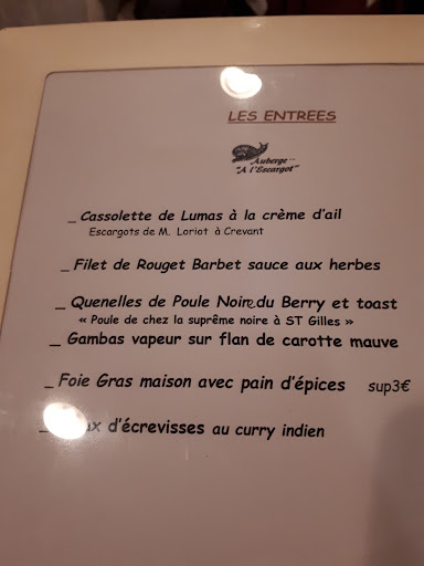 Read moreJe suis allée samedi dernier 28Novembre, diner auberge de l'escargot a la chatre Quelle ne fut pas notre grande surprise, de trouver beaucoup de changement. Nous voulions riz de veau, ( plus de disponible) ensuite un autre plat, a nouveau plus de disponible. Un peu curieux, le pire a venir. Au départ de notre arrivée, la serveuse est venue nous apporter une bouteille, d'un geste malencontreux, a renverser le vin rouge sur une première personne dans mes invités, et cette meme bouteille est venue se vider sur tout le dessus de la table, et finalement a fini, sur le pantalon de mon ami, liquide dans les chaussures. Aucun changement de nappe, simplement donné une serviette pour éponger. Cette même serviette étant plus qu'imbibée, de vin, nous avons demandé par 3 fois a changer de serviette; Il était impossible que nous puissions mettre le coude sur celle ci. Je trouve honteux, la responsable, aurait du changer purement et simplement la nappe. Pour finir, aucun geste commercial, même pas droit gratuitement aux deux cafés demandés, ou même a l’apéritif. Autant nous aimions aller dîner dans cette auberge, Autant maintenant nous ne retournerons pas la bas. Nous avons beaucoup regretté notre soirée, ( finalement ne recommande plus cet établissement) pour moi pas commercial un simple geste ...... même petit mais là pour moi ce n'était pas de rajouter une serviette, c'était tout simplement de changer la nappe...