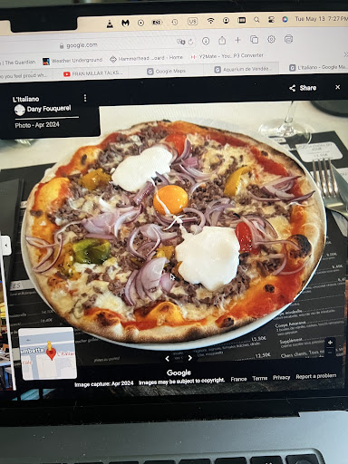 Ordered the pizza hamburger as the image on website showed a very nice pizza. Sadly as shown in second picture it was not what I received. A lot less onions. About ½ the buffalo cheese. Not good value for money. The owners wife drives a new light grey Jaguar F-pace S so we know where money goes… not...
