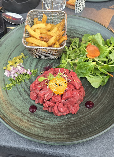 Read moreAmazing setting for this busy little restaurant in the pretty town of Montaigu in the north of the Vendée. The terrace stretches out over the river, with views to the ancient castle ramparts and the bridge over the river. There was a choice of a 2 course ‘plat du jour’ menu or à la carte - we both had the feta salad with grilled vegetables - very tasty! The staff were friendly and service was as quick even though the restaurant was busy. I would recommend...