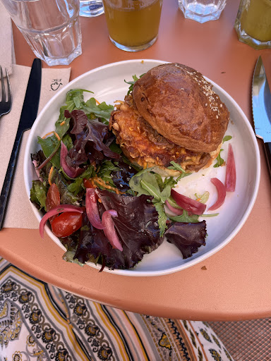 The brunch was delicious. I had salmon and my husband had bacon with the 2 fried eggs, salad, brioche toast, salad and carrot puree. Coffee and habiscus tea, then choice of banana bread or fromage blanc, granola, fruit. My only complaint was that the granola was a bit too browned. It was 25€ each. Do try to make reservations for the terrace on Sunday. There was going to be live music but it hasn't started when...