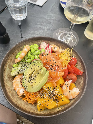 The Food: eveything we ordered was of excellent quality and very tasty. If you like delicious fresh food, I recommend the salmon-avocado-mango tartare and the salmon-prawns poke bowl, both to die for, and well presented. My husband enjoyed the fish & chips and the generous beef burger. Every customer around us was smiling and clearly enjoying their food too. Many thanks to the team in the kitchen! I also liked their wine selection and the prices were very decent. In most places along the seafront, you would pay 6 to 7 euros for a glass of 12cl or have to go for a bottle. Here, you can also choose 25cl or 50cl, which is very convenient.
