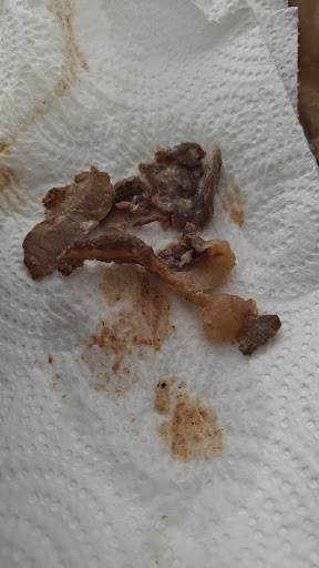 Sur ce que j'ai commandé, j'ai eu quelques surprises. Premièrement, je n'ai pas vu les serviettes ou encore la cuillère en plastique/carton pour manger la glace. Deuxièmement, je n'ai pas eu de portion de frite avec mon burger ni de sauce barbecue, le burger a été fait à l'arrache, je n'ai même pas eu une tranche de pain normale au milieu pour séparer les steaks mais j'ai eu à la place une tranche de pain chapeau qui ferme la partie haute du burger (voir photo). (Sur les photos il y a des frites dans les 2 boîtes parce-qu'on a séparé la portion de frite de mon collègue en 2 histoire que je puisse manger quelques frites quand même). Troisièmement, l'oasis commandé s'est transformé en origina comme par magie. Quatrièmement, la nourriture était toute froide alors qu'on se trouvait qu'à 4 km du kebab...
