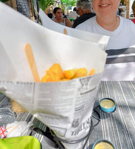 Really nice fish and chips. Order at counter sit down outside at a table and wait. The fish was not the best I have had but I certainly enjoyed it. However, what I really loved was the chips. Never had any like that before. They are like thick, skin-on, curved crisps. Cooked fresh they are crispy and not greasy at all. I had to eat them all. Fish and chips currently €10. I...