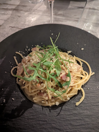 Un exemple de menu, renouvelé chaque semaine : Mises en bouche : oeufs de cailles mimosa. Travail d'orfèvre pour écailler ces mini merveilles et les garnir. Entrée : courgettes jaunes et vertes et concombre, arrangés en une belle fleur avec mousse de ricotta à la menthe. Une délicieuse et magnifique assiette pleine de fraîcheur. Primi : les pachieri fourrées à la mousse de ricotta et épinards avec une crème d'ail succulente et pleine de subtilité. La présentation ? Une merveille aussi originale que technique. Plat : brochettes de St jacques panées à la noisette du Piémont et purée de céleri rave et de morceaux de céleri rave rôti à l'huile de noisette bio. Ce légume totalement pas sexy est transformé en un délicieux miracle surprenant ! Dessert : pavlova de fraises accompagnée d'une marmelade de fraise et agrumes à tomber.