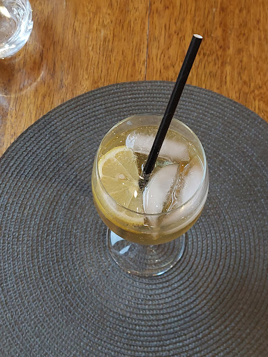 De suite la rue perpendiculaire à la terrasse, et jouxtant la cuisine m'a interpellé. Quelle bonne odeur! un délice....ce fut la première surprise que je ne manquai pas de dire à notre hôte (une charmante serveuse), avec la petite touche de plaisanterie ( et si c'était le voisin qui cuisinait aussi bien !) Bref on y va : tables colorées comme chez moi, j'adore la couleur et c'est rare de trouver une terrasse aussi Melting Pot croyez moi. J'ai l'impression du coup d'être comme chez moi tout en étant dépaysé dans cette cité qui me tend les bras!! Apéritif ? Oui comme tout le monde...sauf que L'Armoire à Cuillers propose ...Rinquinquin ...oui oui , le fameux ou peu connu apéritif à la pèche...si bon que je ne pus m’empêcher d'en commander un second;)