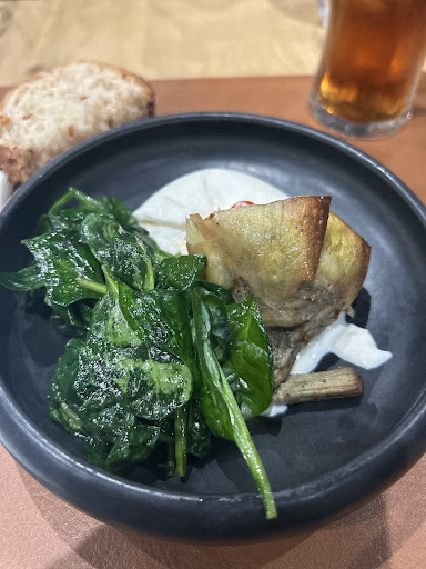 Read moreMenu unique à 42 euros par personne (diner); pas d’autre choix possible (entrée/plat/dessert): 4 entrées à partager pour 2 (pas le choix): gravelax de saumon pas froid et très salé, des tartinades de pois chiche (très fort goût d’ail) et d’artichauts des plus basiques. Sur la table derrière nous, 4 personnes étaient présentes, elles ont eu la même quantité d’entrées à partager que nous à 2 (quid de la logique) Viande rôtisserie ou poisson: nous avons opté pour la rôtisserie et la déception était à la hauteur du prix du menu. 1 morceau de blanc de poulet sec et de jambon (pas de bœuf ni d’agneau - attendu vu le prix du menu). Les légumes et pommes grenailles d’accompagnement étaient très secs malgré le fait que ç’eut été servi avec un jus (qui était d’ailleurs très fade pour une viande rôtie). Dessert: riz au lait, tarte au fruit ou café gourmand. Pris le riz au lait, plutôt bon.