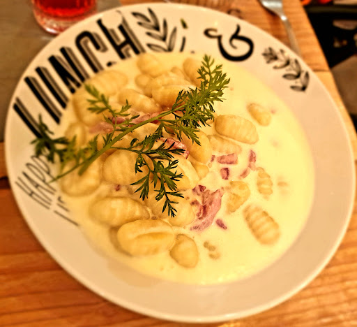 Difficile de donner une meilleure note. La tartelette au Nutella n'en n'a absolument ni le goût ni la couleur. Le Nutella froid c'est assez particulier, j'ai déjà eu l'occasion de faire des desserts froids au Nutella. Là, très objectivement, il est difficile de comprendre d'où vient ce goût qui ressemble plus à du chocolat noir fondu qu'à du Nutella. Je l'ai fait remarquer. Et voilà. La remarque est bien arrivée et tant pis pour moi. OK c'est noté. Sinon les plats sont bons mais servis en quantité très inégales. Les assiettes de gnocchi sont ou copieuse ou... Il faudra prendre un dessert. Bien placé mais ce sera sans moi (nous) la prochaine fois. A croire que le traditionnel accueil français se perd de plus en plus.