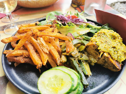Le choix du jour fut simple et heureux. D’un côté, des falafels végétariens parfaitement dorés, croustillants à l’extérieur, tendres au cœur, accompagnés d’une garniture fraîche et relevée qui ne cherchait pas à en faire trop. Loin du cliché sec ou pâteux, ceux-ci avaient du caractère, sans agressivité, et laissaient en bouche une sensation de légèreté.