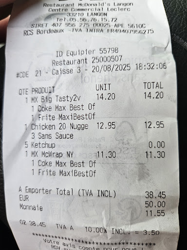 Read moreNous sommes venus chercher notre commande au drive à 23h25 le 21 mai dernier. Le restaurant était donc fermé et il y avait 2 véhicules au drive, dont la nôtre. Personnel aimable et très poli et temps d'attente très correct. Mais en ouvrant notre commande à la maison, nous avons constaté que le ice tea du Maxi Best of Rancher ressemblait à de l'eau légèrement teintée, et sa saveur était...très désagréable, et je reste poli. Quant au Burger Rancher, il ne contenait ni oignons, ni Bacon ! Cela ressemblait à un gris cheese Burger, sans nouvelle saveur en plus ! Deuxièmement, notre commande devait contenir un Big Toasty DOUBLE steaks, mais c'est un Big Toasty SIMPLE steak que nous avons eu, facturé au prix du double steak bien sûr. Et pour finir, comme si cela be suffisait pas, le Royal Deluxe que nous avions commandé était...un Royal Cheese ! Aucune comparaison ! Cela fait tout de même beaucoup d'erreur pour une même commande, surtout qu'on ne peut pas dire qu'il y avait une forte affluence au moment de sa préparation. L'erreur est humaine et cela peut arriver parfois, et cela arrive parfois d'ailleurs, mais à ce niveau là, il s'agit plus d'incompétence ou de manque de considération ! C'est dommage car l'accueil, la qualité des prises de commandes au Drive, tout comme le respect des produits commandés s'étaient nettement améliorés depuis plusieurs mois. Mais là, désolé de le dire ainsi, mais ce fut lamentable ! Attention si un jour, une réelle concurrence venait à pointer son nez à Langon... Franchement très déçus, surtout pour les fidèles clients que nous sommes, et j'espère ne oas dire un jour, les fidèles clients QUE...