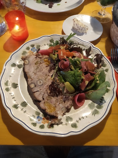 Très bonne soirée passée le 07/04/2022. Bon accueil, la déco est chaleureuse, côté rustique avec un poil de moderne, beau coin pour la cuisson de la viande, donc chaleur agréable par le temps qu'il faisait. Apéro, impec, 2 cocktails très bon, un mojito classique mais maîtrisé, l'autre je ne connaissais pas: purée de framboise, jus de pamplemousse, rhum et crémant. Ça passais tous seul ;) L'entrée! (photo) Halala, en temps normal ça me ferais un repas (sans le dessert il ne faut rien exagérée), mais très bon, belle tranche de terrine de faisan au fruits secs, avec salade, légumes en pickles et cornichon, pas besoin de se gaver de pain, l'accompagnement passe très bien avec :D Le saumon gravelax de ma compagne était très bon aussi :p Le plat! (photo) J'ai cru que je ne pourrais pas finir en le voyant arriver, mais si, belle côte de cochon sauce barbecue avec petite pomme de terre, salade et endive braisée, très bon. Madame avait pris le Saint Pierre, assiette bien garnie, avec les asperge, une ou 2 ravioles si je me souviens, purée et bonne sauce beurre blanc, très réussi. Le dessert, (photo) ma moitié a du changer d'avis après le plat, car le Kouign-amann ne semblait plus une très bonne idée pour ressortir du restaurant sans devoir rouler :D donc son choix s'est tourné vers une Pavlova fruits rouges.... très bon mais copieux xD elle a laissée un peu de meringue et de chantilly, quel gâchis! Moi, c'était le baba au rhum, imbibé comme il fallait, brunoise de pomme et ananas, 2 belles rondelles de citron (je pense) marinées donc tout était mangeable, chantilly et zeste citron et citron vert, j'ai adoré, mais ça m'a finis. Le service était très bien. Nous somme ressortis de là repus, et très satisfait. Produits de qualité, la carte n'est pas à rallonge et c'est tant mieux. À faire les yeux fermés. Le plus, les chats du resto! Un 1er (jeune) s'est pointé, très câlin, il a squatté le coussin du banc (photo), plus tard un 2ème plus vieux est arrivé aussi, il y a eu bagarre entre copain rien de méchant, ça faisait le...