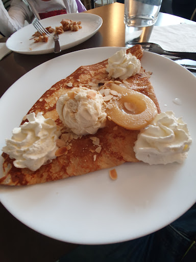 Nous sommes venus dans cet établissement un peu par hasard, alors que nous cherchions un restaurant ouvert le dimanche midi. Les étoiles et les avis très positifs nous ont donc orienté vers Penvénan. Alors, on ne va pas se mentir, le premier contact visuel est assez déroutant, au point de se demander si on ne s'est pas trompé. Une devanture de troquet de village, juste en face de l'église... On est entièrement dans le cliché! Oui, mais... Non! Si le lieu est aussi un bar, il est bien plus moderne que la sempiternelle buvette d'après messe... D'abord, il faut noter que c'est une petite salle, je vous conseille donc vivement d'appeler pour être sûr d'avoir une table! Cela tranche aussi avec ce que dit un autre avis très négatif: un attrape touristes? Ah non, c'est tout le contraire! La carte est très limitée, et évolue selon les produits de saison ( tous locaux, d'ailleurs, gage de qualité et de fraîcheur). Ici, on met en avant des galettes et des crêpes originales ( mais vous pouvez faire votre galette classique avec 1,2 ou 3 ingrédients aussi) avec des noms se référant à des titres de chansons. Je me suis laissé tenter par la "Believe", galette aux épinards, chèvre , noix et miel. La pâte est maison, c'est très appréciable. Et très bon! En dessert, c'est "Elle, elle l'a" qui m'a fait fondre: une crêpe à la confiture de lait, poire pochée à la cannelle, boule de vanille et chantilly... À tester d'urgence!!! Les prix sont vraiment raisonnables , même les boissons, cocktails... Parking juste en face. Et notre toutou a été accepté! Un grand merci pour ce moment...