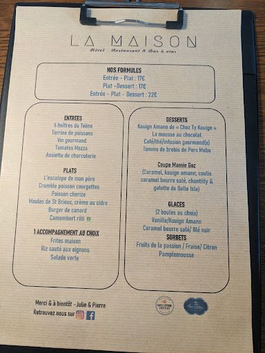 So we arrived at "la Maison" from the GR34, after hitting a dead end in a swamp, and we were literally mud up to the knees. As we passed the door we discovered this sweet and elegant nest that feels more like a 4 or at least 3 stars hotel than the 2 rated . Our though: oh my gosh we are going to ruin there place should we really enter? Well.. We were warmly welcome as any regular customer, not a stare or a comment and in my experience such professionalism is pretty rare in France. This "lieu" is run by two kind gentlemen and there Maison and is kind of an odd one out as you don't expect to find a little gem like this "here". It only makes me regret not to have known before hand and tried there restaurant. I would advise you to take your breakfast there as it's fairly priced and generous. As far as the room are concerned, they are less sophisticated than the lobby more in ad-equation with the 2* rating of the hotel, i.e fair with a light touch of originality and taste in there decoration. La Maison double as a wine bar, they also offer a few cocktails, Should I be picky, I would say that they should step up there game on the cocktail side to be more on pair with the rest. Merci. Dog welcome / and there own dog is...
