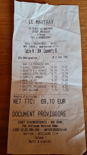 Vous êtes totalement de mauvaise fois , mon mari qui est venu régler n'était pas satisfait de l attente ( nous sommes bien arrivés à 13h05 et avons été servis à 14h10 , et ticket de paiement à 14h37 ) Le supplément TERRASSE indiqué en supplément INGREDIENT est indiqué à 2 euros et non 20 cts sur notre TICKET ( cf la photo de l autre commentaire )