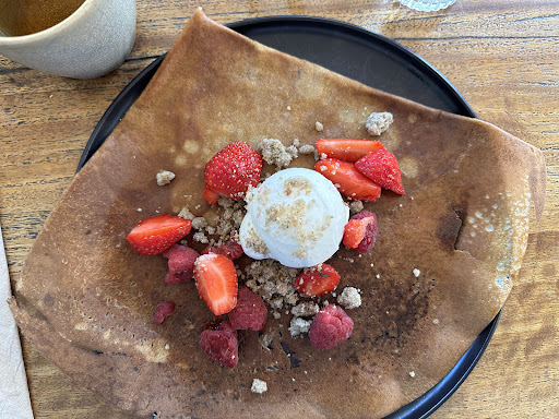 I really like the type of "sarrasin Paste" (buckwheat) they use on the there galette, unlike most other crêperie, the receipt they use is closer to the old traditional way IMHO, with a galette structure very different from the "froment"'s one. Presentation of the galette is nice even on the simple "complète" with a simple but very nice touche of colore, overall there is a welcome attention to detail in the presentation of every dishes that makes them stands out. While a lot of "crêperie" now days try do do that, I think they succeed while not over inflating the price. Service or rather management did not seems understandable to me: they rather have you wait at the bar across the street that propose you to have a drink at there place while they switch from there brunch service up to 1130 to there lunch service 1200. Also avoid at all cost the "table haute" they are wobbly and unless you are 6"2 a nightmare o sit in sit out. Don't get why they direct you to those while the...