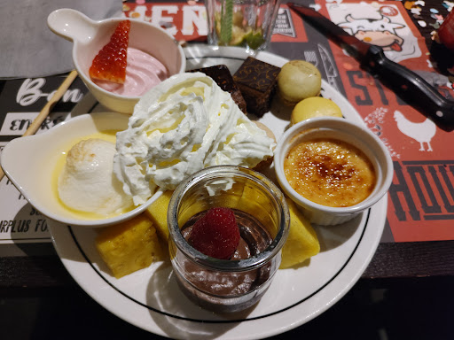 Read moreJe trouve que c'est toujours difficile de juger un tel établissement qui propose de la nourriture à volonté. Le nom du restaurant, plutôt évocateur "steak house" ou "maison du steak" en français, laisse présager un style de cuisine ... Mais en fait, en rentrant dans ce restaurant, déjà nous avons été très surpris par l'entrée, ou l'espère de véranda qu'il faut traverser, remplie de fleurs et plantes. Nous avons cru un instant que nous nous étions trompés d'endroit. Puis à l'intérieur, nous avons découvert une énorme salle de restaurant à la décoration surprenante. Par moment asiatique, avec des ombrelles chinoises au plafond sur une partie de la salle. Ou encore avec un espace carbé plutôt polynésien dans un autre coin. Certaines tables sont insérées dans de grandes cages. Original finalement. Enfin bref, très déstabilisant cette déco. Un serveur finit par nous prendre rapidement en compte et vient nous placer, sans trop nous expliquer le fonctionnement du restaurant. La commande des boissons est également rapidement prise. J'ai tout de même un doute sur mon cocktail qui était sensé contenir de l'alcool... En fait pour les cocktails, ils sont apparemment tous déclinés en sans alcool et en avec alcool. Mais le mien, s'il contenait vraiment de l'alcool, ne devait pas en contenir beaucoup. Pour l'eau, on vous demande d'aller vous servir, non pas à une fontaine, mais carrément en prenant un pichet, à côté d'un évier avec un robinet. Du jamais vu pour moi ... Au vu des énormes buffets, on comprend qu'il faut aller se servir. Alors là, tous les types de cuisine se mélangent. Ou du moins on retrouve différents types de cuisine, regroupées entre elles. En entrées, il y a des sushis et makis, de la charcuterie, des salades de crudités ou autres, des crustacés (par contre pour les huîtres qui ne sont pas ouvertes, pas pratique sans couteau adapté que je cherche encore) Personnellement, pour connaître au moins un restaurant spécialisé dans les sushis et makis, j'ai trouvé ceux proposés ici, beaux mais pas trop goûteux. Pour les plats de viande ou de poisson et les garnitures, c'est assez complet. Cela reste convenable en goût. Par contre, le canard laqué était beaucoup trop cuit et le poulet au caramel un peu trop gélatineux. Un bon assortiment de déserts (gâteaux, fruits et glaces). L'ananas, qui semblait frais, était excellent.