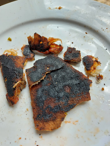 Beste heer/mevrouw, het zou u sieren om mijn gehele review te (vertalen en te) lezen. Ik plaatste onder andere een opmerking over de prijs van de dozen (wilt u daar ook een foto van misschien?), die werden gevraagd om de pizza's mee te nemen en de volgende dag als snack/lunch te gebruiken. Uw borden mochten we uiteraard niet meenemen, vandaar dat het op een eigen bord is afgebeeld. Ik steek mijn handen in uw hoge vuur om te garanderen dat dit de bodem van één van de 4 pizza's was. Om u hopelijk iets gerust te stellen: 2 van de 4 pizza's waren niet zwartgeblakerd aan de bodem. Overall blijft de nasmaak bitter, en door uw kortaf en van geen enkel begrip doorspekte reactie zelfs nog iets bitterder. Ik wens u veel sterkte met uw gemoed en verdere...