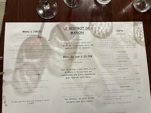 Read moreLa semaine dernière, petit séjour en Ardèche qui nous a conduit à faire une virée à Aubenas pour manger en soirée. Nous n'avions rien réservé et c'est au hasard que nous sommes passés devant le Bistrot de Manon, la carte ne nous a pas déplu. Après un tour vers les autres établissements, nous sommes revenus et c'est très sympathiquement que nous avons été accueillis par un charmant monsieur souriant, un petit arrangement des tables puisque nous étions 5 et c'est parti pour une super découverte des plats proposés par une cuisinière passionnée et cela se retrouve dans l'assiette. Du service à la cuisine, tout est parfait. Restaurant au calme, très proche du château, tout en étant assez loin de l'agitation quand on recherche un endroit paisible. Si appelés à passer à Aubenas, nous n'hésiterons pas à revenir au...