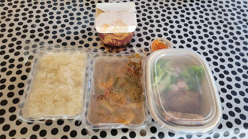 Eten wordt in plastic gesealde bakken meegegeven zodat het goed warm blijft. Rijst met garnalen in sojasaus gekozen, bami goreng met kip (noodles) en martabak. Alles was lekker, vers, goed van smaak. Vooral de bami goreng is een aanrader en ook voor de kids een goede gezonde maaltijd ipv snacks/pizza's op de camping. Kortom aanrader als je op een nabijgelegen...