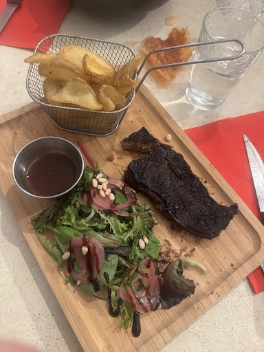 Il ne connaît même pas sa carte, incapable de me dire ce qu’il y a dans la planche de fromages. Je commande un rumsteck très cuit. Résultat ? Une heure d’attente pour trois plats, sans pain, sans sel, sans poivre sur la table. Mon steak arrive noir, cramé, sec, plus dur qu’une semelle. Impossible à couper, encore moins à avaler. (lorsqu’on demande un steak saignant c’est pas parce qu’il y a mot saigner que ça doit dégouliner de sang = pareil quand on demande bien cuit ça ne veut pas dire CRAMÉ)
