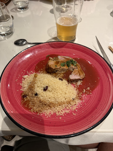 Read more32 € le menu, une vraie affaire… si vous aimez les buffets invisibles ! En entrée, la maison ose vous surprendre avec de l’originalité : trois pauvres bouts de melon plantés sur des piques à brochette avec une bille de mozza et une tomate cerises, façon apéro chez Tatie. Le plat ? Un minuscule morceau de viande, accompagné d’une cuillère à soupe de semoule (oui juste de la semoule, pas de petits légumes, rien.), attention, pas deux, faut pas abuser. Et pour finir, le dessert "généreux" : un moelleux amande-abricot pas mauvais, mais vu le prix, j’espérais presque une pluie de pétales de roses en bonus. Et quand on s’étonne, on nous explique que c’est parce que la clientèle est surtout composée de curistes… Ah, donc 32 € pour un régime minceur imposé ? Brillant concept ! Ici, l’addition est plus copieuse...