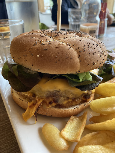 The food was okay. I had the burger, and there was potato in it, which I found weird. Besides the potato it was just okay! The bursts salat was also just okay. Nothing extraordinary, unfortunately. The waiter (man) was very nice and kind and smiling. The waiter (lady) seemed rude and not very nice also when we came with the food to costumers, it seems like she just threw the plate...