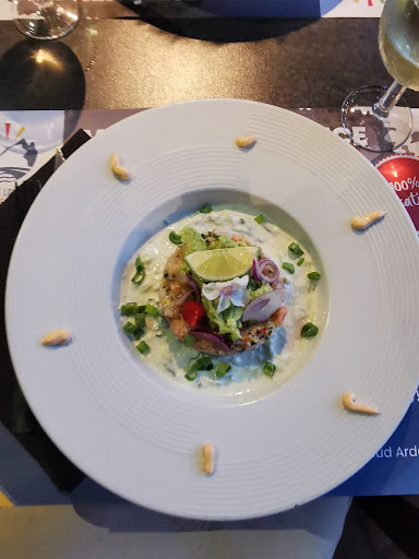 La patronne, Sabine nous a cuisiné un tartare de St Jacques, de St Pierre et de saumon sur un lit de taboulé au tzatziki Un régal! 😍