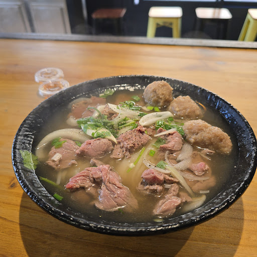 Pho was terrible: cheap meatballs, beef was undercooked, and hard to chew. Spring rolls and fried shrimp were extremely oily, cooked in old oil, and did not even touch them. Cooking place is dirty. The food tray is dirty. Spoon for my soup was greasy - I don't know if they even wash dishes properly. Pho is 12 euros, which is expensive for a buillon with soja meatballs. Staff is nice...