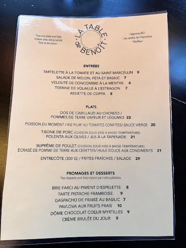 Très très belle découverte ! Accueil chaleureux par deux serveuses aux petits soins tout au long du dîner. Nous avons commencé le repas avec un amuse-bouche au curry offert par le chef. En entrée, le velouté concombre-menthe était très frais et délicieux. En plat, mon amie a pris le cabillaud au chorizo (qui manquait peut-être un tout petit peu de chorizo), mais la cuisson était parfaite et les légumes frais et de saison. De mon côté, pièce de porc avec polenta aux olives : un régal ! En dessert, le gaspacho de fraises et la mousse au chocolat avec un insert cassis (initialement myrtille, mais le chef n’était pas satisfait de la myrtille du jour : un vrai gage de qualité, un chef qui goûte ses plats et manie les produits à merveille) ont été la touche parfaite pour clôturer ce dîner. Le chef, Benoît, est passé en fin de service pour nous demander si nous avions apprécié le repas. En bref, un restaurant avec une très bonne ambiance, des produits frais, de saison et d’une grande qualité (ça s’est ressenti dans chaque plat !) avec une superbe équipe en cuisine et en salle. Entrée, plat, dessert et boisson, nous en avons eu pour moins de 40€ par personne. Le rapport qualité-prix est imbattable. Nous y retournerons...