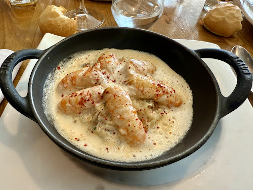 What a wonderful, delicious experience! The atmosphere was simple but very clean and welcoming the seats were very comfortable and the dining area was spotless. The amuse-bouche was delicious and consisted of a Parmesan infused foie gras mouse that melted in your mouth accompanied by a small spoon sized serving of a wonderful silky cod mix that had a slightly salty but rich flavor. I ordered the carpaccio of fish served with slightly sweet pickled onions and herbs with a serveral dollops of a Dijon mustard sauce. It was fantastic! My wife enjoyed her appetizer of a large portion of fresh foie gras served with an apple chutney and toast points that tasted like sweet corn meal. What a delightful combination. We shared both and we were very happy! I ordered a glass of a 2017 St Emillion bordeaux. The only complaint I have is that the glass it was served in was too small for such a good wine. It took too long to fully open up in such a small glass. That aside our mains were fantastic and I would even say superior! My wife had the Langoustine risotto and it was "to die for" silky and smooth risotto with mouth watering texture accompanied by 7 or a perfectly prepared Langoustine, wonderful! I enjoyed a perfectly cooked (rare is my jam) beef fillet served with delicious asparagus and smooth mashed potatoes surrounded by a generous serving of an exquisitely prepared morel sauce. Paired with my Bordeaux this was the best lunch we have had in a very long time! For desert we shared a wonderful entremet ala orange to send a perfect meal into the stratosphere. Just wonderful!! Our compliments to the very talented chef and very friendly and attentive staff. We cannot praise...