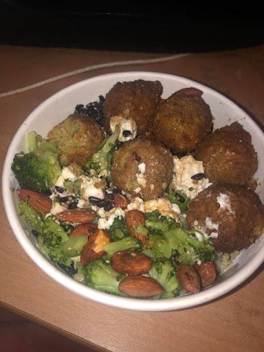 Personnellement je commande une base riz vinaigré sauce soja sucré avec Avocat, oignons frit, fromage frais, concombre, carotte, graine de sésame et un topping de 7 falafels....pourquoi ne pas mettre des falafels apres tout il y a bien des pizzas à l'ananas (ou des lustres en roseau tressé à 1,5m au dessus des toilettes 😉)