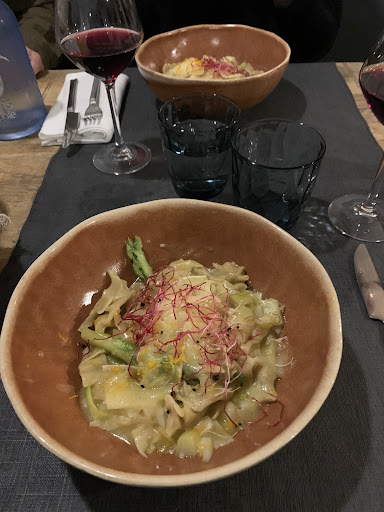 Simple, yet beautifully cooked. Starting with a deep fried mozzarella ball served on mushrooms and peas, going on to a pollock served on a bed of braised leaks with a chorizo crumb and a shellfish sauce. I finished with a mandarine pannacotta with a chocolate crumb.