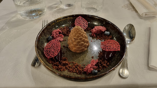 Read moreUn restaurant gastronomique avec des saveurs au rendez vous et des produits de qualité. La salle du restaurant a de grandes baies vitrées en guise de mur sur 2 de ses côtés avec une vue sur le jardin. Cela donne l'impression de manger dans le jardin. De l'autre côté, on peut voir l'interieur de la cuisine. C'est toujours intéressant de voir comment sont préparés les plats et il n'y a ni odeur, ni bruit. Les plats ont vraiment du gout et les saveurs se marient bien. C'est un régal. Dans le menu Sequoia, j'ai pris "Le melon", "Le veau" et la mousse au chocolat. L'entrée est donc un tartare de melon et magret de canard qui se marient parfaitement. Je dirais qu'il y a davantage de magret que de melon. Les légumes du plat chaud etaient délicieux, les champignons accompagnaient très bien le veau qui n'était pas sec. En dessert, la mousse au chocolat en forme de pomme de pin était surprenante, bien qu'un peu trop compacte. Le reste de l'assiette était bien au dessus, avec un genre de crunch et de la glace, très champêtre. J'ai aussi pu goûter le dessert "La figue" qui m'a ramené en enfance avec une saveur lavande incroyable. Je me suis retrouvé sur le plateau de Valensole en Provence. Les assiettes de fromages, dégustées en chambre, sont toutes les deux très bonne. Nous allons chercher où trouver ces fromages pour en ramener. Finalement, j'ai davantage mangé par gourmandise que par faim. Je recommande vivement...