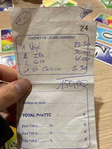 Enfin, lors du paiement, nous avons constaté qu'une bouteille de vin, affichée à 12,50 € au comptoir, nous a été facturée à 24,50 €, ce qui a créé une incompréhension totale. J'ai donc décidé de retourner vers le personnel pour poser la question, et là, le manque de respect était flagrant. Il semblait que, vu mon jeune âge, le propriétaire ait voulu me minimiser. Cela a été la goutte d'eau qui a fait déborder le vase, et une dispute a éclaté, sans aucune excuse de la part du propriétaire ou du jeune serveur.