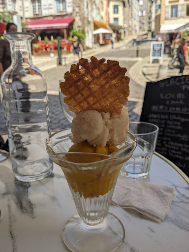 I loved visiting this café everyday during my five-day stay in Le Puy. The service was wonderfully friendly. Our server would take the time to help me with my French pronunciation when I was ordering. The fresh fruit sorbet is so flavourful. Unlike anything available in North America. The galette was delicious and gently flavoured. A lovely, light lunch on a warm June day. The view and ambience when sitting at the front of the café is a wonderful Le Puy experience, with the view of the fountain and cathedral. It offers wonderful people-watching too, as it's a busy spot for...