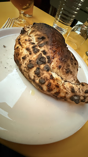 Pour quelqu'un qui a déjà passé, en cumulé, plusieurs années de sa vie en Italie, cela s'appelle une douche froide ! Une "calzone" sans goût (esthétique ou au palais), perdue dans une assiette pourtant de taille moyenne et de plus brûlée sur 80% et non cuite en dessous !!! Clou de la soirée, la mienne : pizza avec tranches d'aubergines grillées (il y a longtemps que je n'avais pas mangé de chewing-gum 😬) des "tomates cerises" dont la peau était immangeable et donnait l'impression d'avoir du plastique en bouche 🤦🏻♂️, un jambon cru "basique" et insipide et la rucola n'a pas besoin de recouvrir la pizza sinon elle chauffe, s'agglomère et est immangeable (elle doit apporter piquant et fraîcheur). Quant à la taille de la pizza ovale ! Dans la longueur à peine 25 cm et dans la largeur à peine 20 cm. L'expression française est : "du foutage de g...", non?La pizza n'était absolument pas cuite et pas levée ( entre 1 et 2 mm !) et cela se voyait à l'intérieur du cornicione ainsi que sous la garniture (pâte collante et filante). La serveuse (qui a compris qu'elle ne pourrait me faire gober le prétexte des caractéristiques de la pizza napoletana) n'a pas eu besoin d'explication et a tout de suite compris le problème en voyant l'assiette et ce que mon palais ne pouvait plus accepter. Conséquence : nous nous en sommes arrêtés là... Je ne me souviens même pas la dernière fois où je n'ai fini une pizza ! Une pizza de cette taille, à ce tarif et de cette qualité, vous tenez 1 mois dans le sud de l'Italie ! J'ai assisté au massacre culinaire d'un fleuron culturel et historique du Bel Paese, à l'étranger. J'espère que vous rectifierez le tir rapidement. C'est bien d'être servi rapidement mais il ne faut pas confondre vitesse et précipitation ! Sous peine de grosses désillusions pour les clients car une pizza à la pâte non cuite n'est PAS...