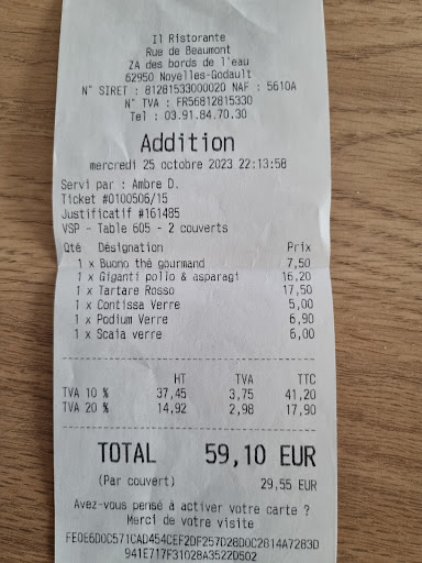 Nous avons été servis par Quentin grâce à qui nous avons passé un agréable moment ! Très bon service également avec l'aide de sa collègue (une demoiselle brune) très professionnelle et agréable! Accueil par le responsable qui n'a pas vraiment la prestance d'un responsable de salle, autant dans la démarche, l'attitude (Il mâche, mange je ne sais pas mais peut importe, pas ouf devant le client), la façon de parler (on comprend la moitié sans être méchante), très nonchalant. Le service était très agréable et sympatique avec Quentin avec qui nous avons passé un très bon moment. Au niveau de la cuisine, la farandole en entrée est un délice, je ne m'en lasse pas! Cocktails et vin très bons. Le tartare de bœuf était excellent, les pizzas aussi, par contre très déçue pour la véritable carbonara, énormément de morceaux de gras qui prennent malheureusement le dessus sur le goût du plat, et écœurent très vite. Et avoir ça en bouche ce pas très agréable. Les desserts étaient très bons également. Globalement je suis déçue du style de service que devient il ristorante, l'ambiance n'est pas très agréable au global malgré les efforts de quelques bons éléments. J'ai failli oublier le barman, qui devrait parler un peu moins fort, rien de positif à dire à son sujet. Entre critiques de son équipe, manque de respect envers les clients, crier haut et fort à 21h "vivement que je me casse " ou monter sur les sièges ou les clients s'assoient avec ses chaussures pour accéder à une bouteille sans prendre la peine de frotter derrière, l'attitude au global est à revoir. Je suis triste de voir la qualité de ce restaurant être en baisse, je voulait quand même préciser que je n'ai jamais eu affaire à cette équipe. C'est la première fois, je suis la plupart du temps accueillie par un responsable qui s'appelle Nicolas il me semble et d'habitude tout se passe sans emcombres avec une très bonne ambiance!