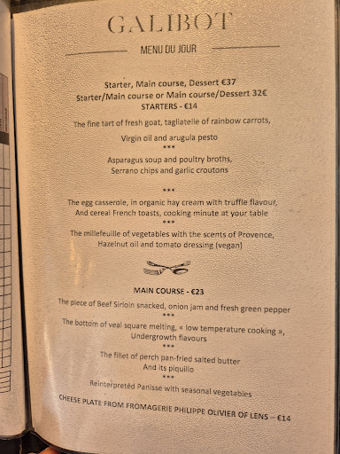 Nice establishment with very attentive friendly waiters but the food is bland and no time is given in between the starters, main and dessert. I started with the local dish that has liver and kidneys which was served luke warm and did not taste very well. The waiter was so kind to replace it immediately with the salmon millefeuille at no charge. As it was immediately served, it became clear that these have been prepared beforehand, I guess the same with the other starters and also the desserts that are just kept in a fridge. A mousse was layered between the salmon layers but had no distinctive flavour, just filling. Imediately after that the meat was presented, correctly baked but just a small flat steak, not very tender. I just had finished that and the dessert 'terril', white choclate inside a pyramid of a crusty dark chocolate, was served. Nice presentation but little taste again apart from just a sugar overload. Paid 50euros for a meal that one would get in a mediocre bristrot. Very...