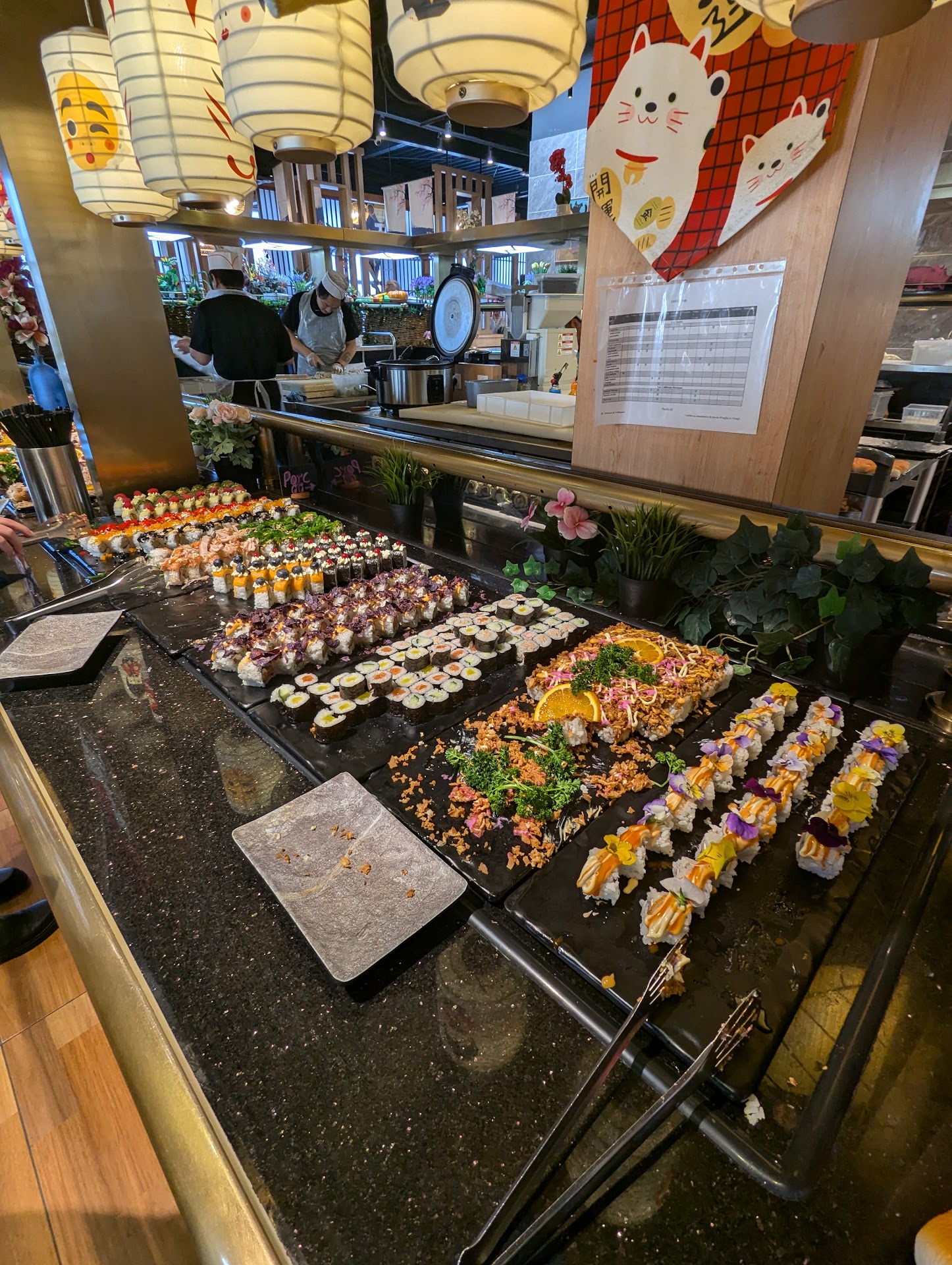 🍙Maki et sushis de toutes sortes, bons et bien faits ! 🎣 Large choix de poissons et crustacés (cru ou cuits) 🍰🍬le plus grand coin dessert que j'ai jamais vu, gâteaux très bons -Naan, Cheese naan (indien) et crêpes sucrées faites maisons, du jamais vu en restaurant asiatique. 🌾 Nouilles de blé ET de riz ! top pour les personnes intolérantes au gluten ! Du choix en plat cuisinés, en salades froides, en tout en fait 😂