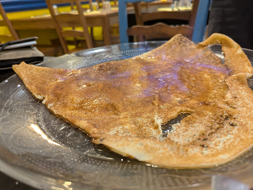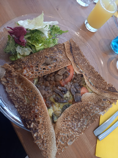 Mais on vient surtout au restaurant pour bien manger, et je suis désolé de dire que ces galettes sont les plus mauvaises que j'ai mangé de ma vie. Spongieuses et sans saveurs... Une galette emmental pré-cuite sur laquelle on a déposé des petits morceaux de poulet sec, des noix, et des morceaux de Roquefort (?) tout blanc et dur (vous savez, la partie dont personne ne veut dans ce fromage... ), le tout réchauffé rapidement et fortement au point de donner un gout de brûler à la " galette ". Et tout ça pour la somme de 15€, donc d'autant plus de mal à la digérer...