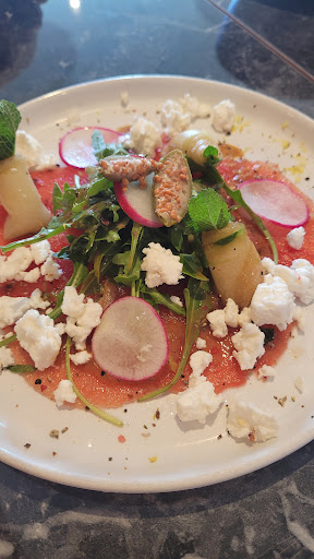 Read moreSuperbe expérience culinaire ! Nous y sommes allés avec mes parents la semaine dernière et avons été séduits par l'atmosphère qui se dégage à peine passées les portes du restaurant. La déco est de très bon goût, à la fois sophistiquée sans être pédante, moderne sans être froide. Par ailleurs, la salle séparée en deux rend l'acoustique plutôt bonne (c'est agréable) ! Nous avons été accueillis chaleureusement, avec une équipe attentive qui n'a quasi pas besoin de communiquer avec des mots entre elle tant le service est fluide et rôdé. Concernant la nourriture : les entrées étaient très bonnes (mention spéciale pour la pastèque aux agrumes + fêta et câpres), les plats excellents (la cuisson de la sole + la générosité des légumes ou encore la gourmandise du poulpe à la cuisson parfaite et enfin l'aubergine fondante à souhait et parfaitement assaisonnée). Les desserts étaient bon et originaux, pour autant un peu moins à notre goût. Mais cela n'a pas du tout terni notre expérience (à vrai dire, nous n'avions déjà plus faim - pure gourmandise). J'ai déjà hâte d'y retourner ! Merci et bravo pour ce...