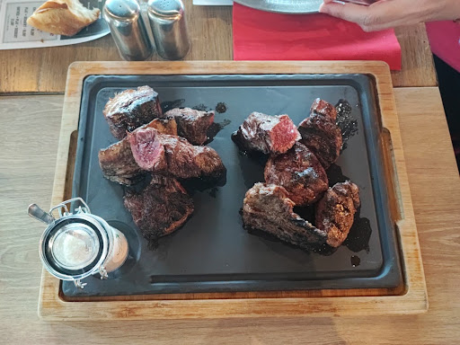 Une super viande avec une côte de bœuf cuit à la perfection et très bonne comme toujours Meilleur restaurant de viande sur les sables et son alentour car avec sa cuisson au feu de bois sa change tout et super toujours une cuisson comme nous la voulons recommande l'ardoise ou vous pouvez découvrir plusieurs...