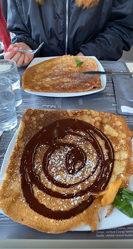 Le repas : nous voulions manger des moules et visiblement cela n’était pas la saison (ce qui semble vrai) cependant il est précisé par la serveuse que si il y avait des moules à la carte cela serait des produits frais… Et la grande surprise lors de la prise de commande : une soupe de poisson qui n’est pas faite maison, lors de notre envie de prendre des St Jacques, elles sont congelés et enfin lorsqu’on demande des frites on nous précise que ce sont des McCain mais qu’elles sont très bonnes… Nous composons ainsi notre galette pour n’avoir presque aucun fromage en prenant du camembert et du chèvre !