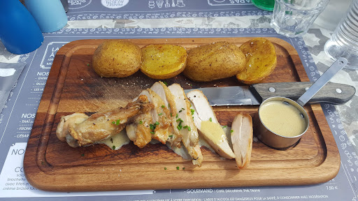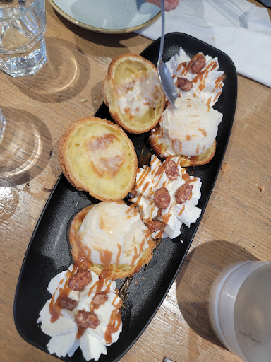 Si la perfection existe elle est incontestablement ici. Les serveurs Angèle et Rémi ont une présentation impeccable. Rémi porte à merveille son contre courant. Tout y est. Coupe mulet. Collier. Tatouages. J'ai adoré. Angèle a les cheveux attachés. Ça devient rare. Les deux ont le sourire facile ce qui ajoute au plaisir de nos échanges. Les menus sont variés. J'ai choisi le burger fromage raclette aiguillettes volaille cuites absolument à la perfection. Avec des pommes de terres frites en lamelles. Mon amie Geneviève a pris du tartare qu'elle apprécie toujours. Puis nous avons pris un dessert tellement copieux que nous l'avons partagé. Je n'avais jamais vu de profiteroles aussi énormes. Dans l'attente de nos plats on a le temps d'observer les allées venues et les comportements. Rien à redire. Ils sont tous prodigieux. On est en fin de saison et le soir. Ils doivent être fatigués. Mais ça ne se voit pas. On oublie souvent les personnes cachées mais j'ai bien pensé au cuisinier qui envoie les plats bien chauds. C'est très appréciable. A coup sûr je reviendrai. J'ai rarement été aussi satisfaite d'un restaurant. Avec en prime une vue sur la mer. Que du bonheur. Et je leur ai dit directement avant de partir. Bravo à cette...