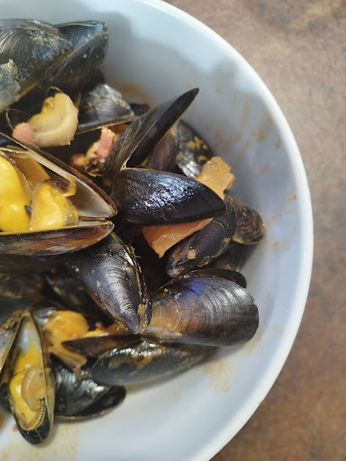 ✨ Mais l'attente vallait le détour, nous ne sommes pas déçus, les moules sont d'une taille remarquable, charnues ! J'en ai jamais vues de cette taille ! Quant aux recettes, ellet sont très bonnes : une marinière classique réussie, une gourmande Bretonne, une Maison et une Paysanne !! C'est gourmand, c'est goûteux, crémeux 😋. Et la cuisson du coquillage est parfaite ! Et pour cause ! A la fin du repas, en discutant avec le gérant, il nous dit qu'il s'agit là d'une espèce Label Rouge, et qu'ils ont misé dessus il y a seulement un an ! Et sans changer le tarif de leur carte, il a dit que c'était un très bon choix ! Nous, on le remercie d'avoir gardé ses mêmes tarifs car c 'est très appréciable ! Pour l'explication, cela mériterait d'être mis en valeur sur la carte , car il connaît ses produits , et la passion transparaît dans ses mots !!